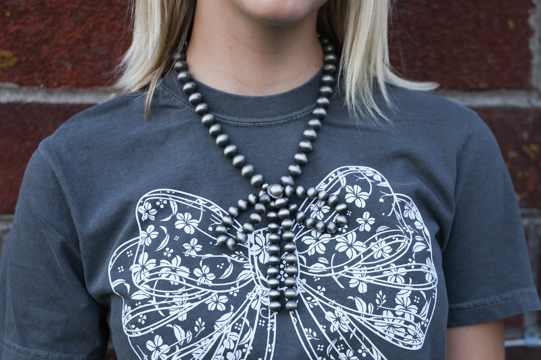 Indulge in the beauty of our Faux Bow Necklace featuring Large Faux Pearls, perfect for adorning your neck in a sophisticated and elegant manner. This 16-inch necklace exudes charm and grace, making it a must-have accessory for any fashion-forward individual.