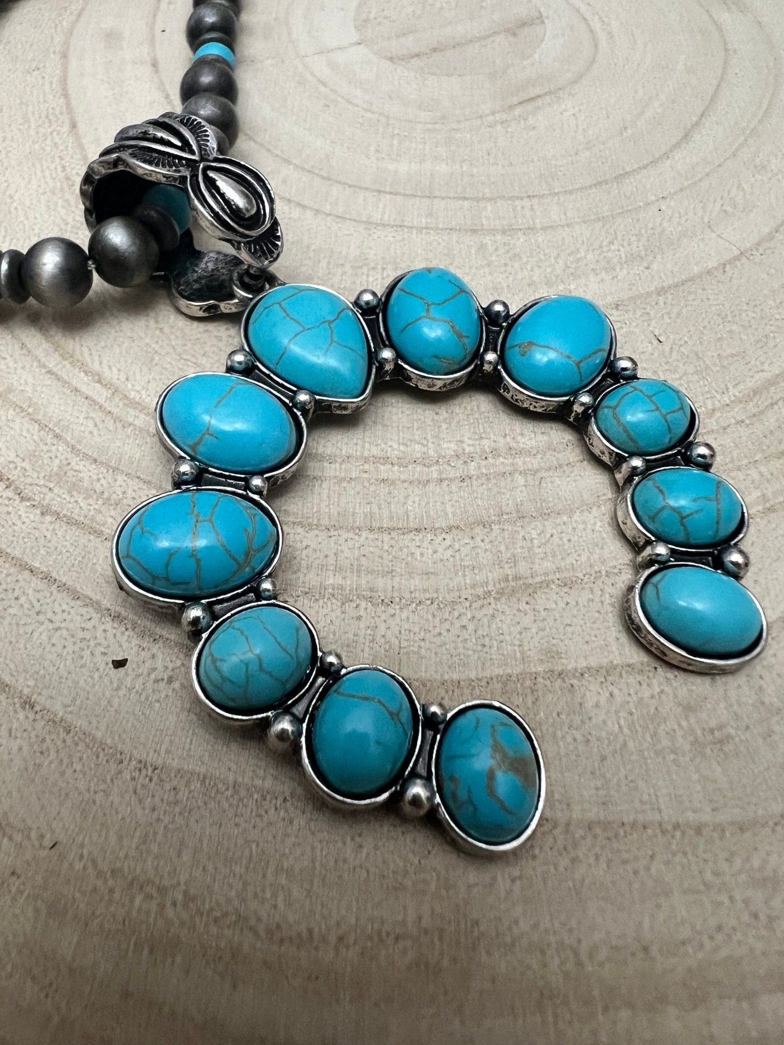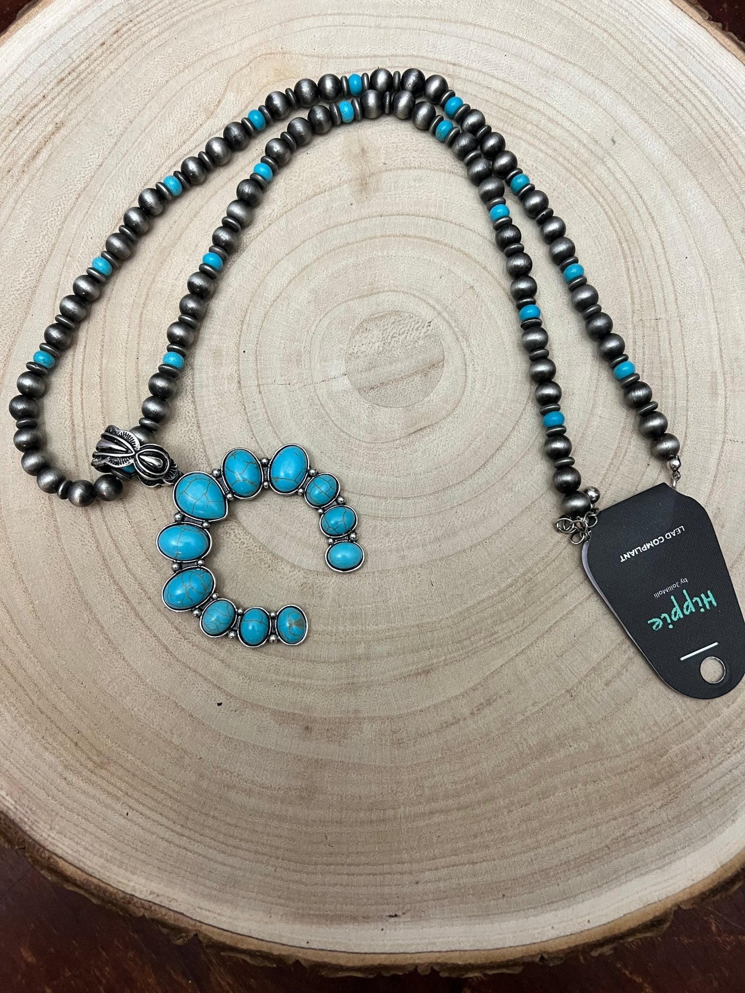 Elevate your Western style with this 27-inch Faux Naja and Faux Pearl Necklace. Crafted to capture the iconic squash blossom design, this necklace features beautifully arranged faux pearls that add a touch of elegance without the cost of real silver.