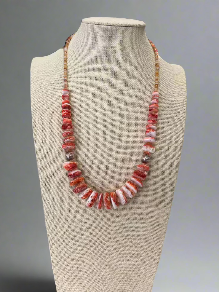 With its vibrant orange spiny oyster and turquoise beads arranged in a graduated pattern, this 22 inch necklace adds a bold pop of Western style to any outfit.