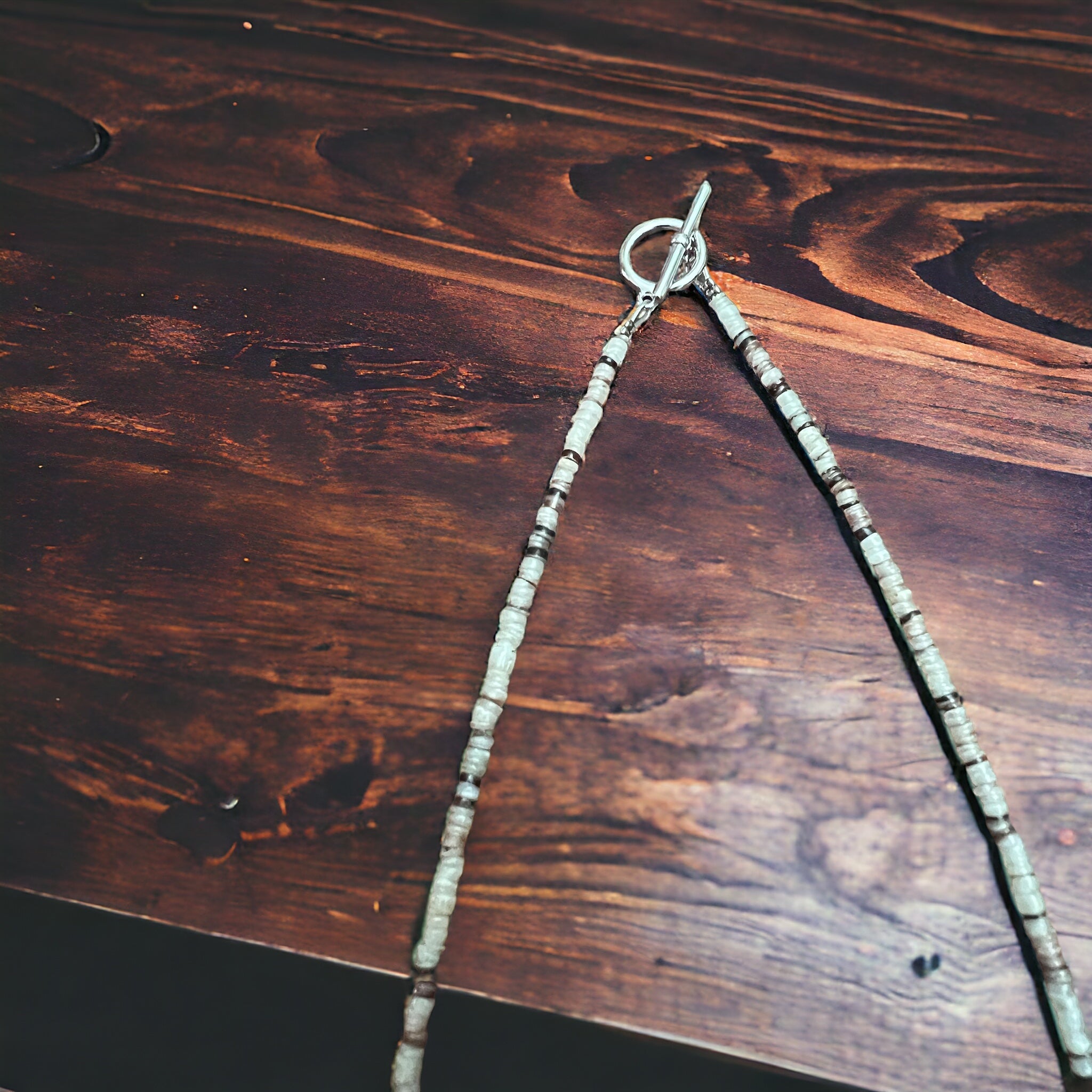 Thick blue chips of genuine turquoise necklace and shell.   Tailored to fit your unique style, this 26 inch necklace features a variety of natural turquoise chips with hints of brown and dark beige. The colors and shapes vary, giving each piece its own distinct character. With a tarnish-resistant finish, this necklace is perfect for any occasion.