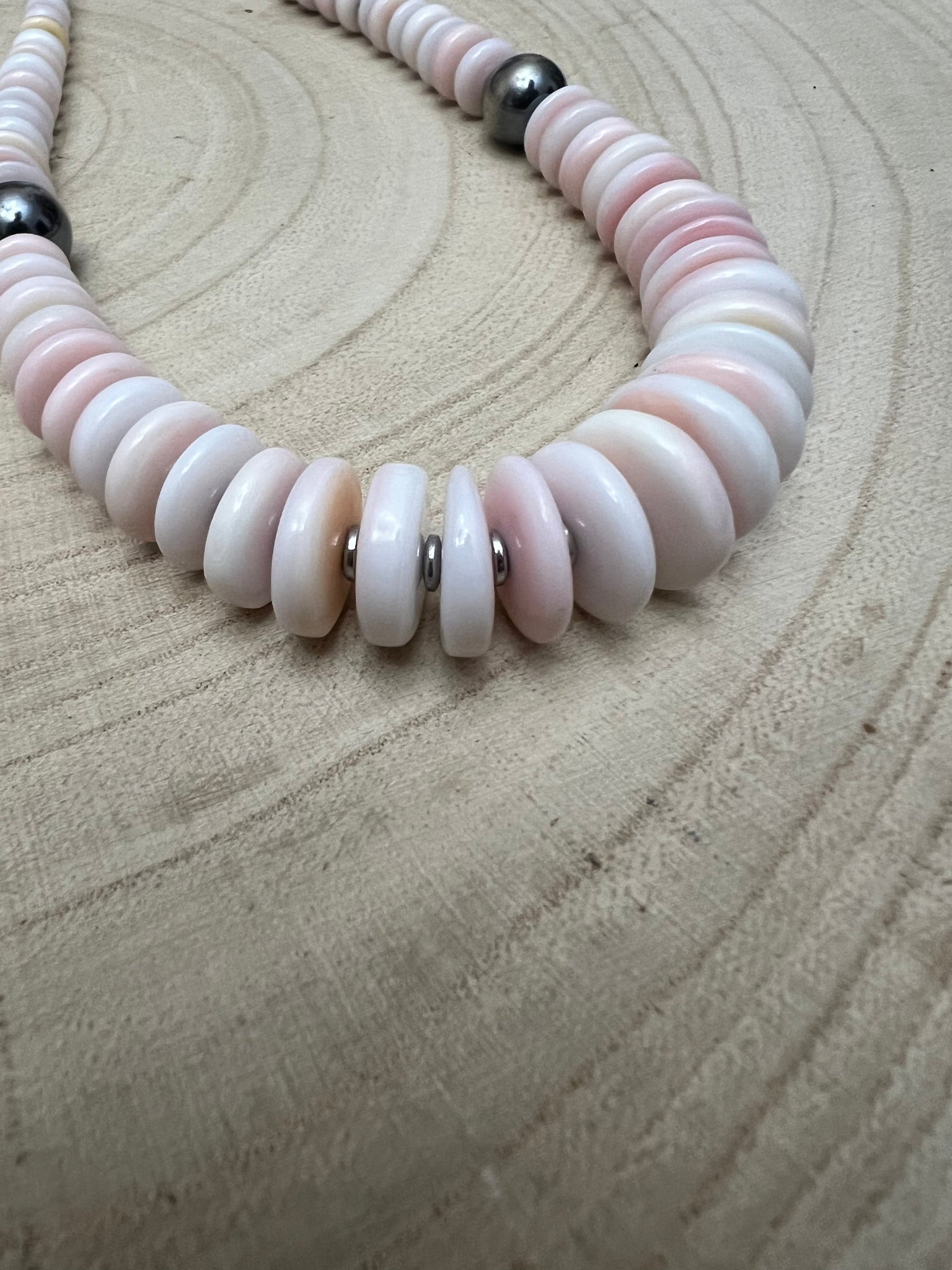 This rare gem quality soft pink conch necklace is handcrafted with love in North Texas. This 23-inch necklace features graduated pink conch beads paired with hematite saucers and finished with 10mm sterling silver pearls and a non-tarnish sterling hook. Every necklace is one of a kind—each bead varies slightly in shape and color, making yours completely unique.