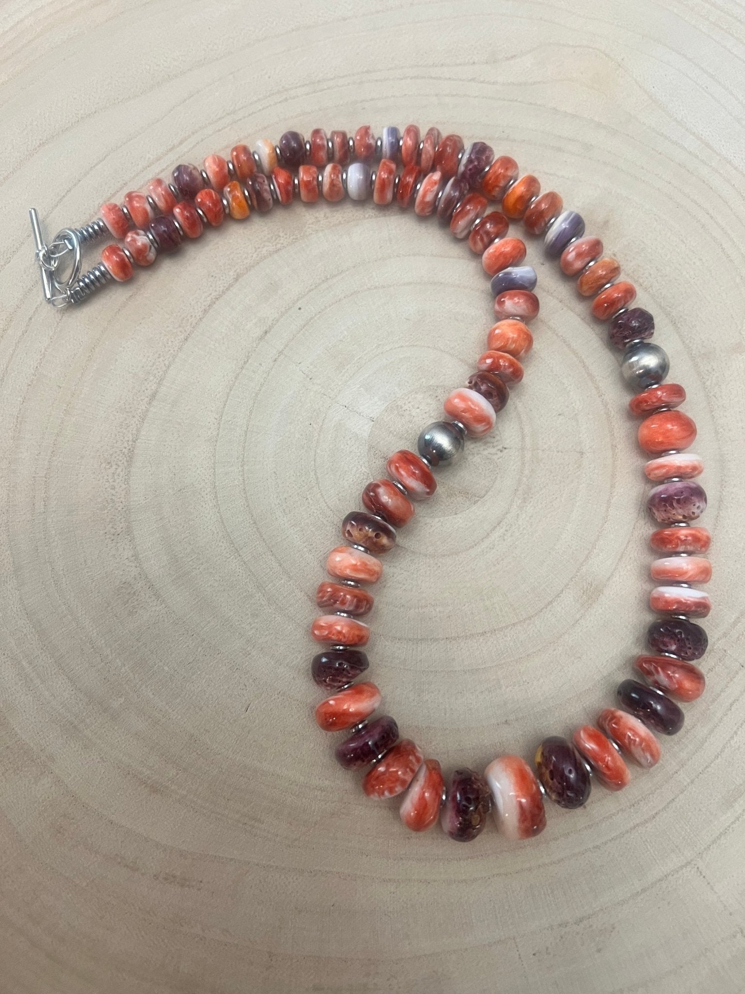 This 22-inch necklace features vibrant spiny oyster shells in striking purple and orange hues with 4mm Hematite saucers.   Each necklace is unique from the natural beauty of genuine shells. Perfect for adding a bold, Western-inspired touch to your outfit, this necklace blends rugged charm with colorful elegance. Its distinctive shells make every necklace one-of-a-kind, ideal for those who appreciate authentic, handcrafted accessories that stand out. Whether worn for special occasions or everyday style, this necklace brings a splash of Southwestern spirit to your look.