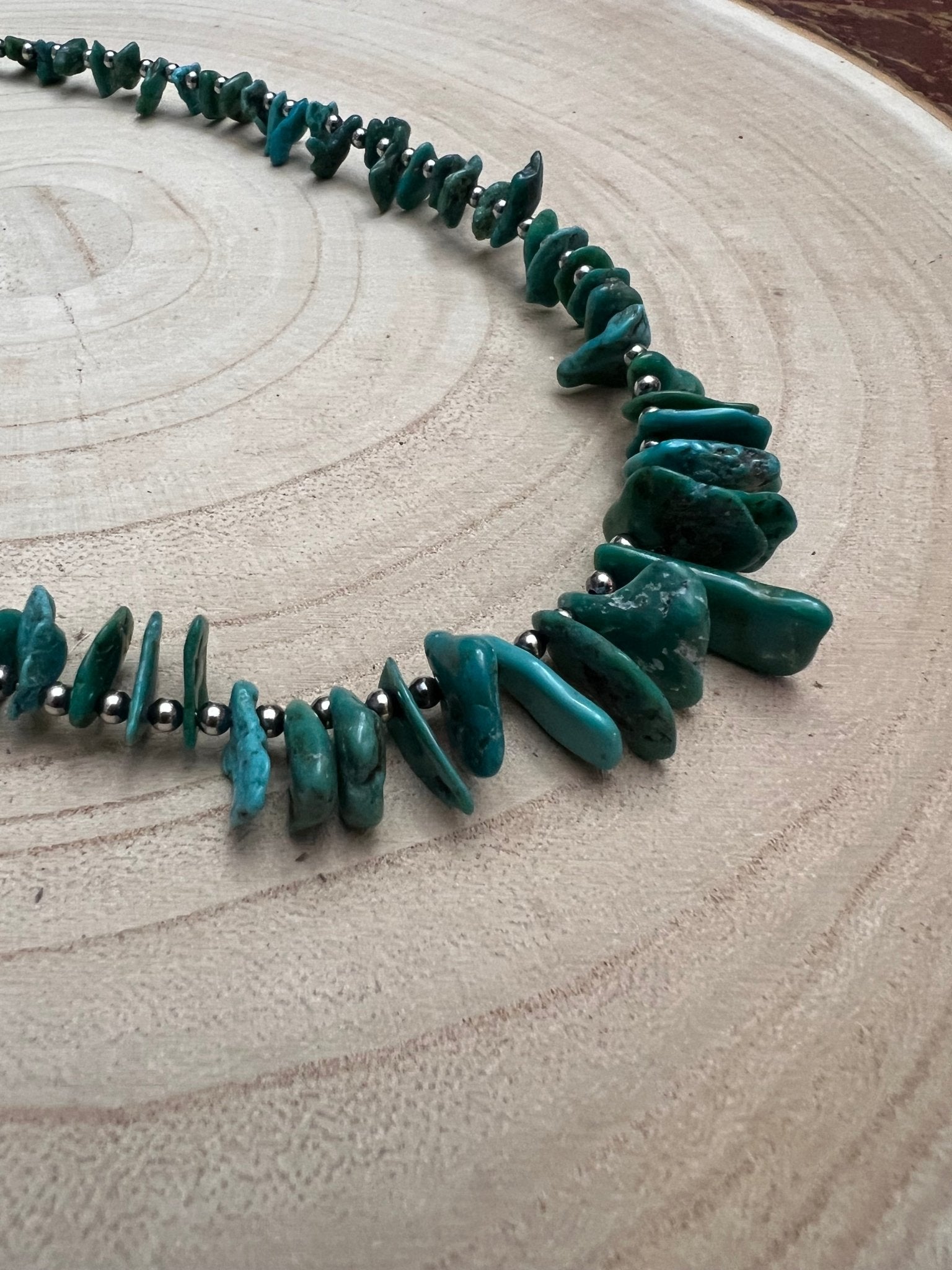 Indulge in this amazing necklace!  American turquoise paired with 3 mm sterling silver pearls, creating a unique and versatile 18-inch necklace. Each handcrafted piece is one-of-a-kind, varying in size and color. Complete the look with a tarnished hook clasp. Perfect for any occasion, from weddings to Western fashion, this authentic and carefully crafted jewelry is the perfect addition to any collection.