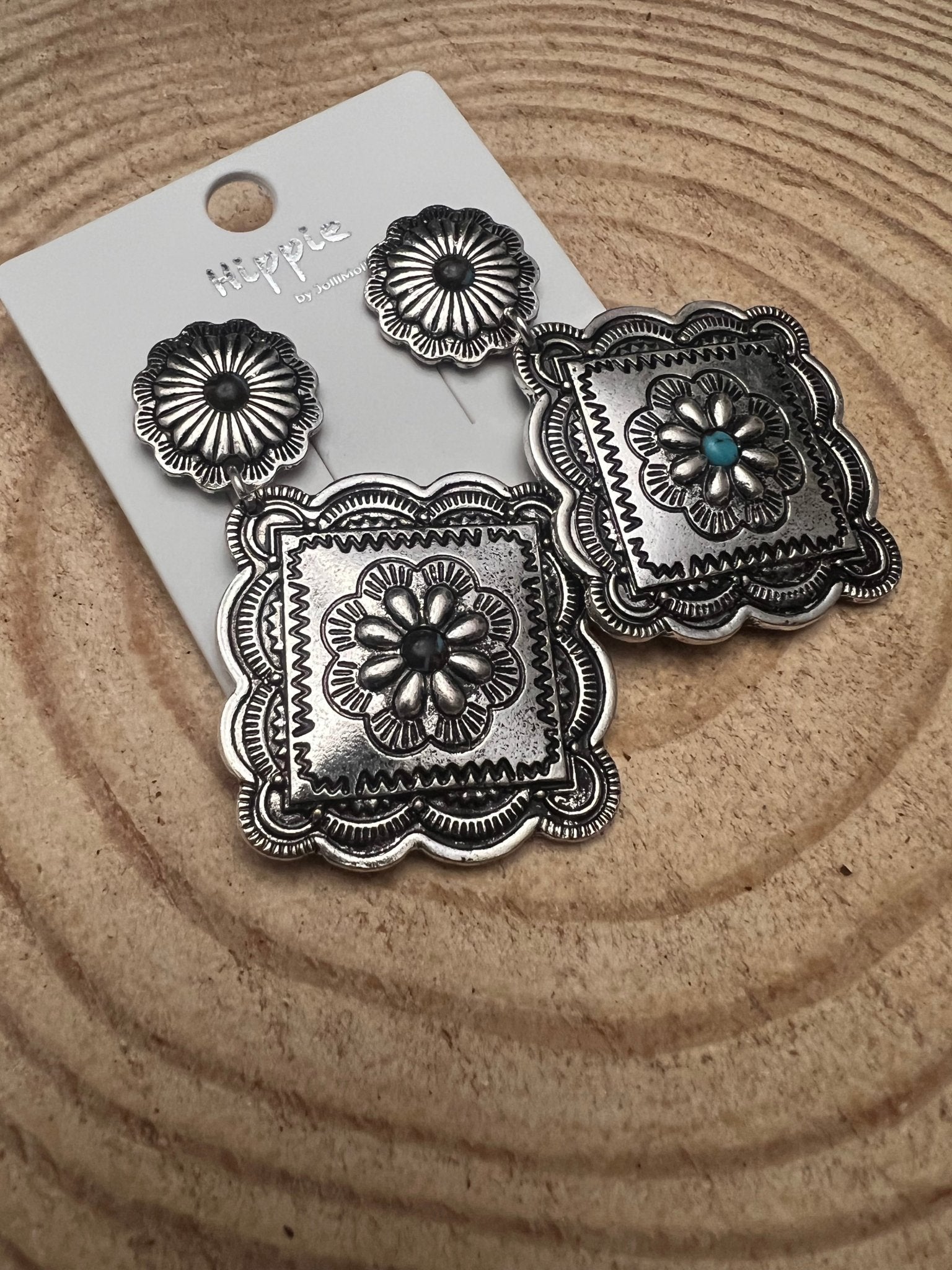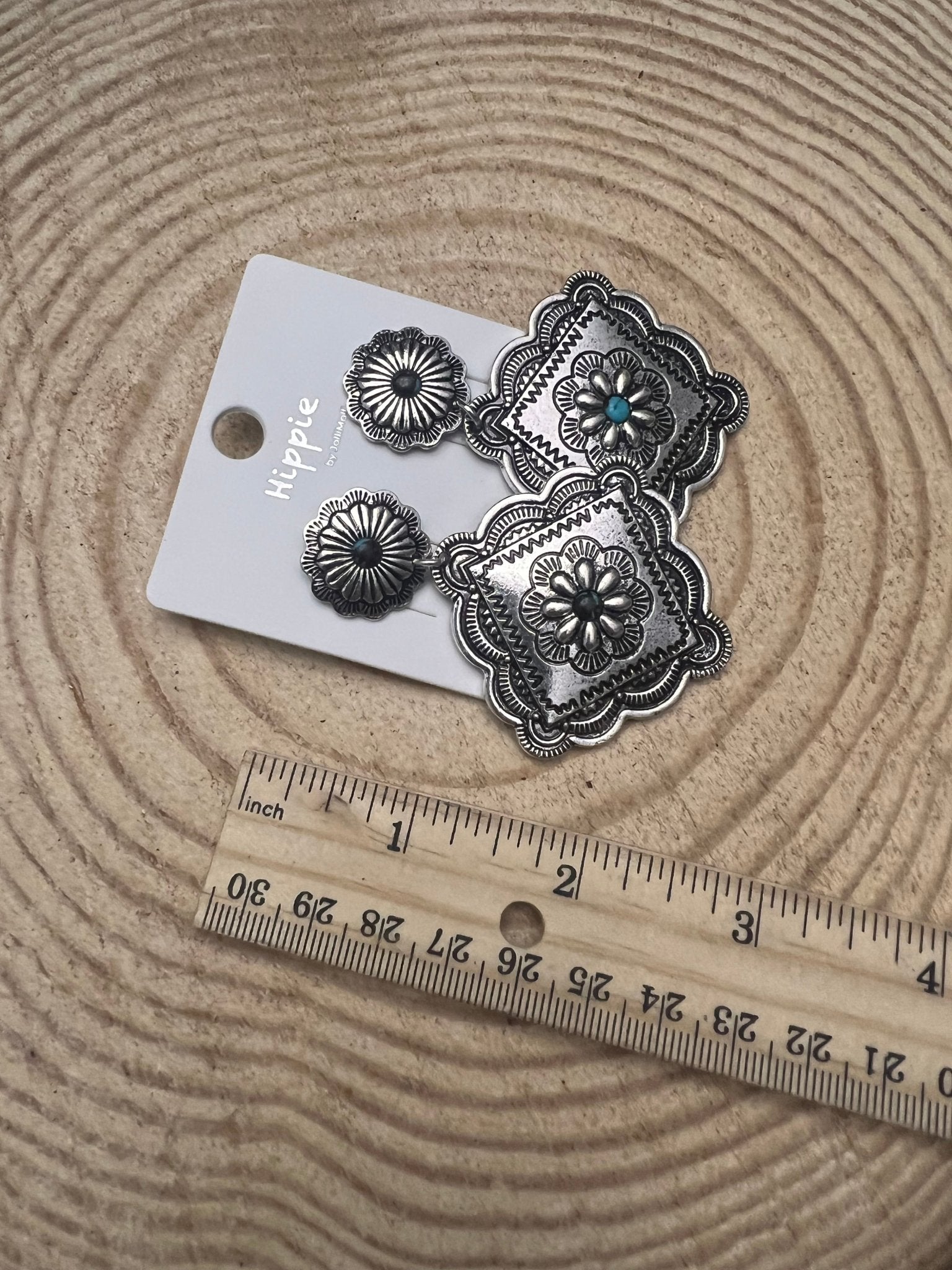 Add some flair to your accessory collection with these stunning earrings. The beautiful multi-color stones will add a touch of color to any outfit, making you stand out in a crowd. Plus, with their 2 1/2 inch drop, these earrings make an elegant statement without weighing you down. Perfect for any occasion, you'll love the versatility and style of these Western Concho Dangle Earrings.