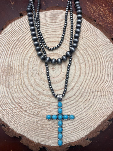 3 Layered Necklace with Faux Turquoise Cross Pendant - 16, 18 and 26 inch