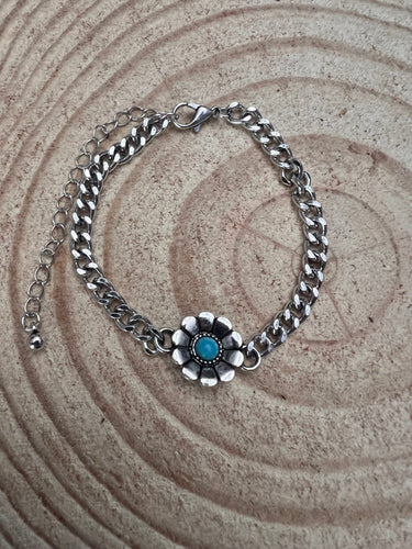 Flower and Faux Turquoise Cuban Chain Bracelet