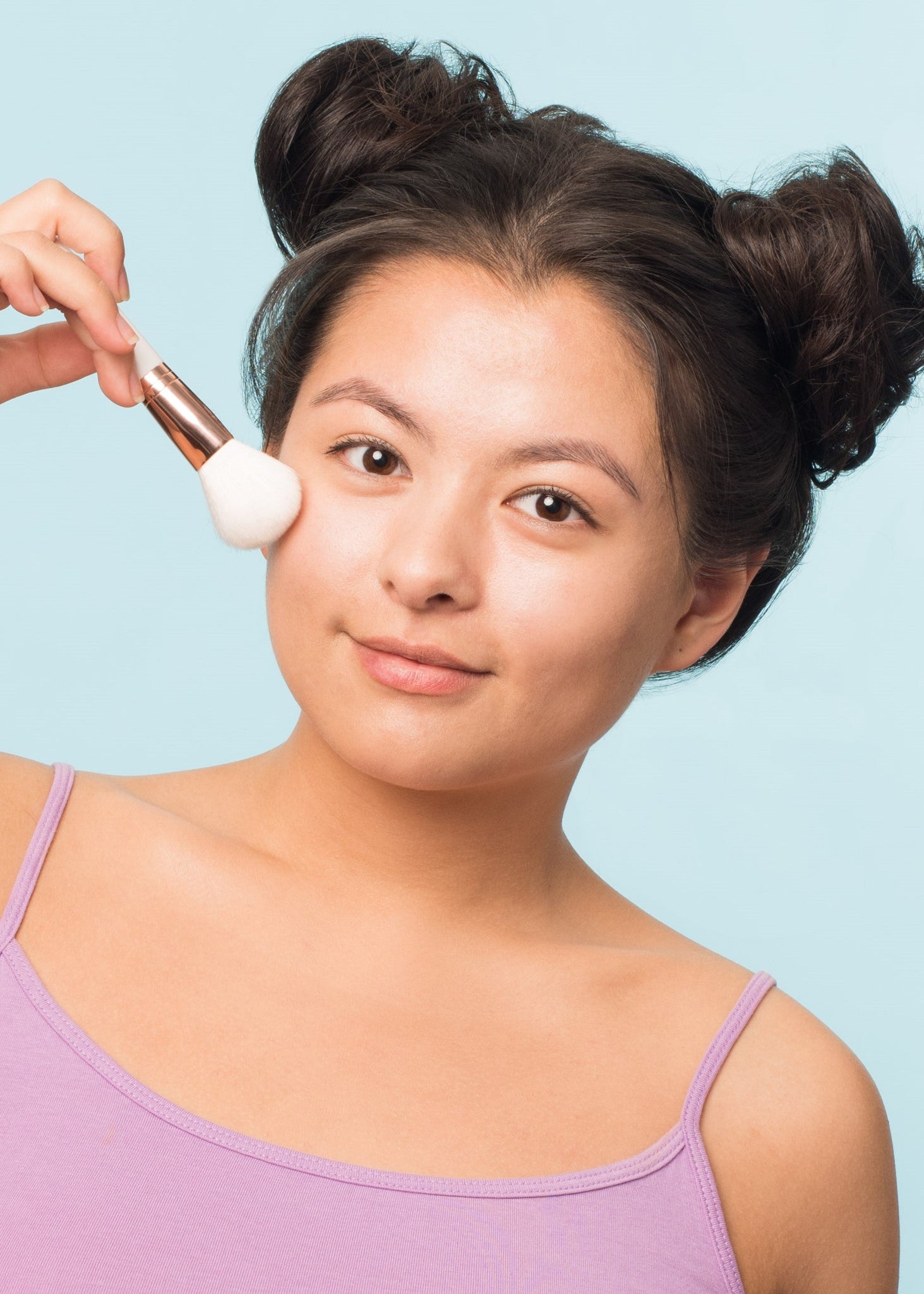 Dip the powder brush in powder, tap off any excess, and dust it on face to set makeup. Use it on shiny spots to mattify skin throughout the day.