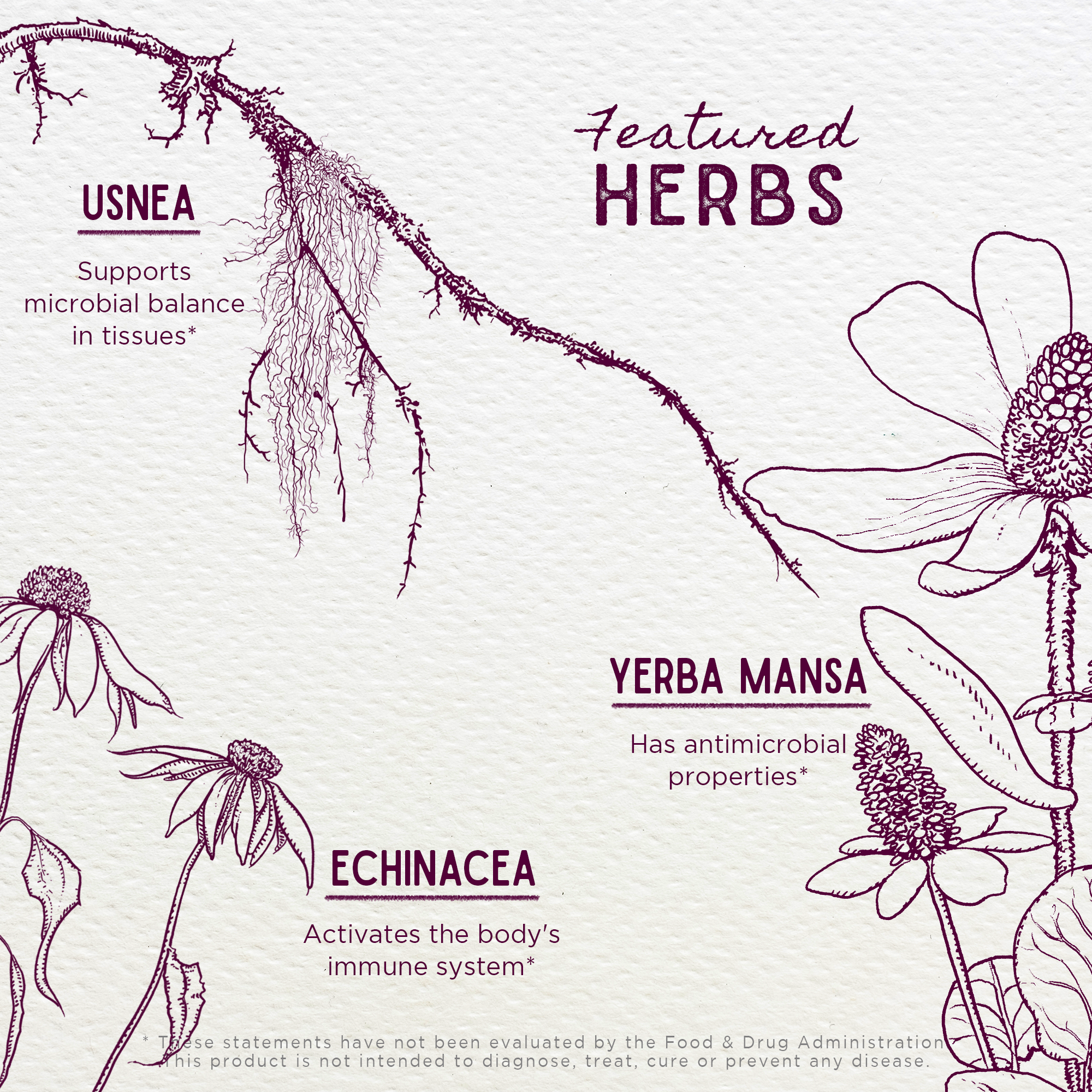 Organic Monarda aerials (Monarda didyma), Yerba Mansa root (Anemopsis californica), Usnea lichen (Usnea spp.), organic Spilanthes aerials (Acmella oleracea), organic Myrrh gum (Commiphora molmol, C. myrrha), organic Echinacea purpurea root (Echinacea purpurea), organic gluten-free alcohol, vegetable glycerine & Rocky Mountain artesian spring water.