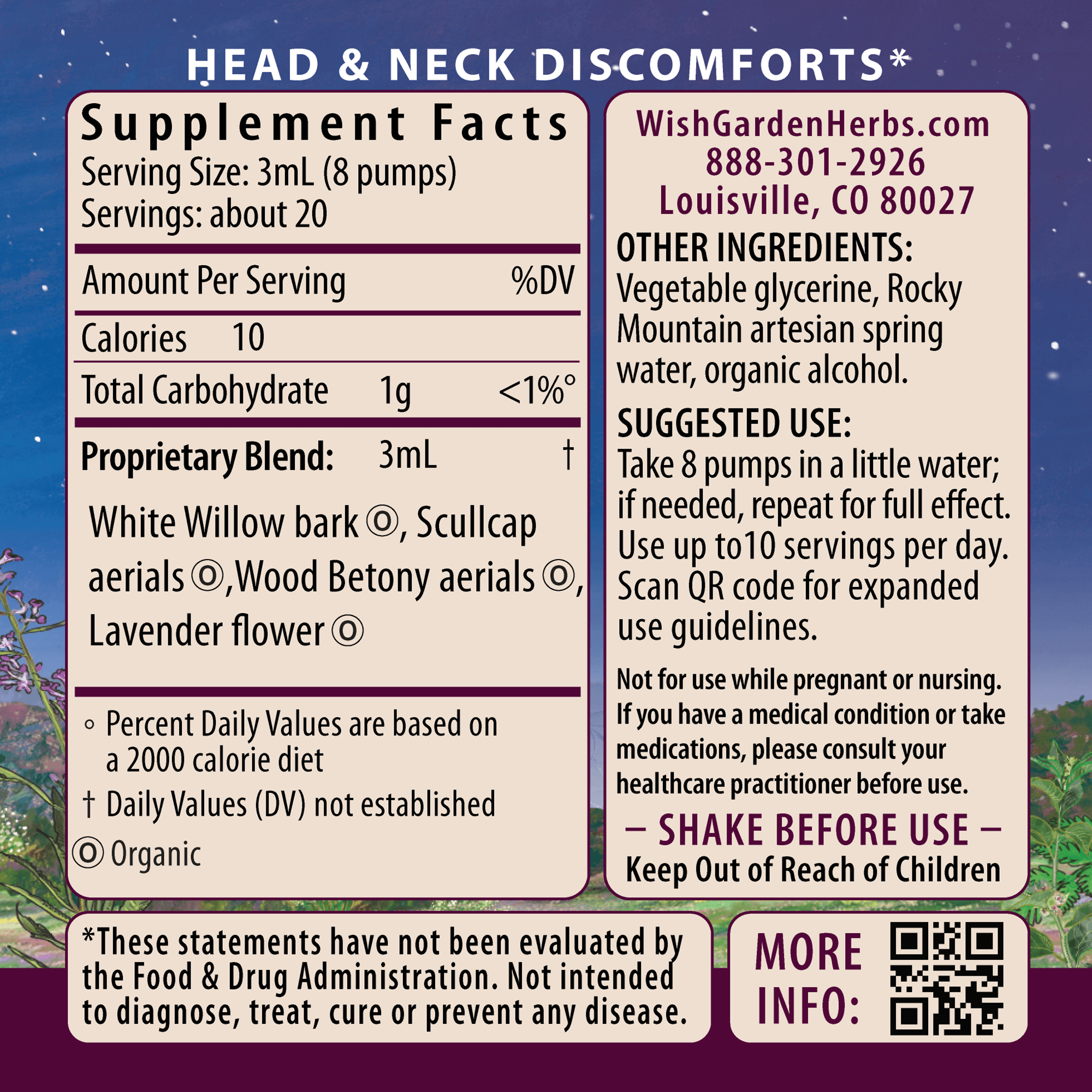 Organic White Willow bark (Salix alba), organic Scullcap aerials (Scutellaria lateriflora), organic Wood Betony (European) aerials (Stachys officinalis), organic Lavender flower (Lavandula officinalis, L. intermedia, L. angustifolia), Rocky Mountain artesian spring water, vegetable glycerine & organic gluten-free alcohol.