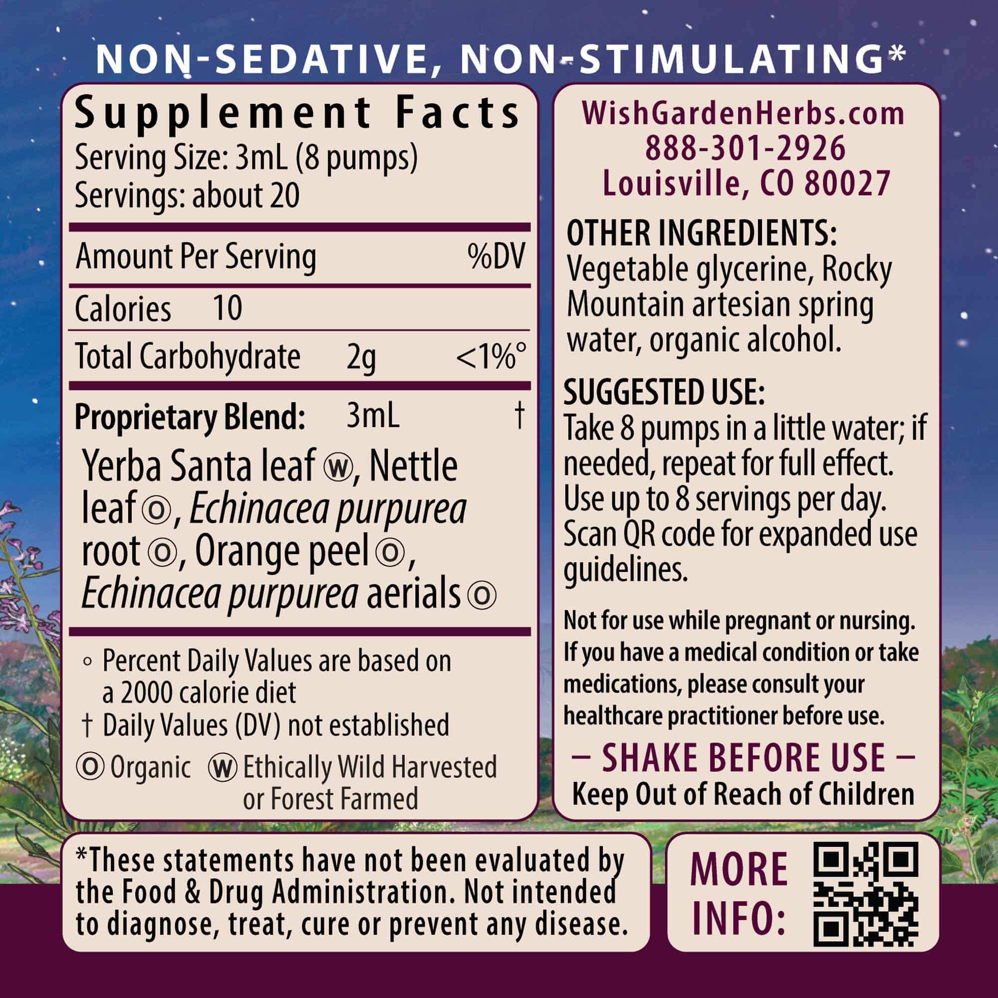 Yerba Santa leaf (Eriodictyon spp. (californicum, angustifolium, crassifolium, trichocalyx)), organic Nettle leaf (Urtica dioica), organic Echinacea purpurea root (Echinacea purpurea), organic Orange peel (Citrus sinensis), organic Echinacea purpurea aerials (Echinacea purpurea), vegetable glycerine, Rocky Mountain artesian spring water & organic gluten-free alcohol.