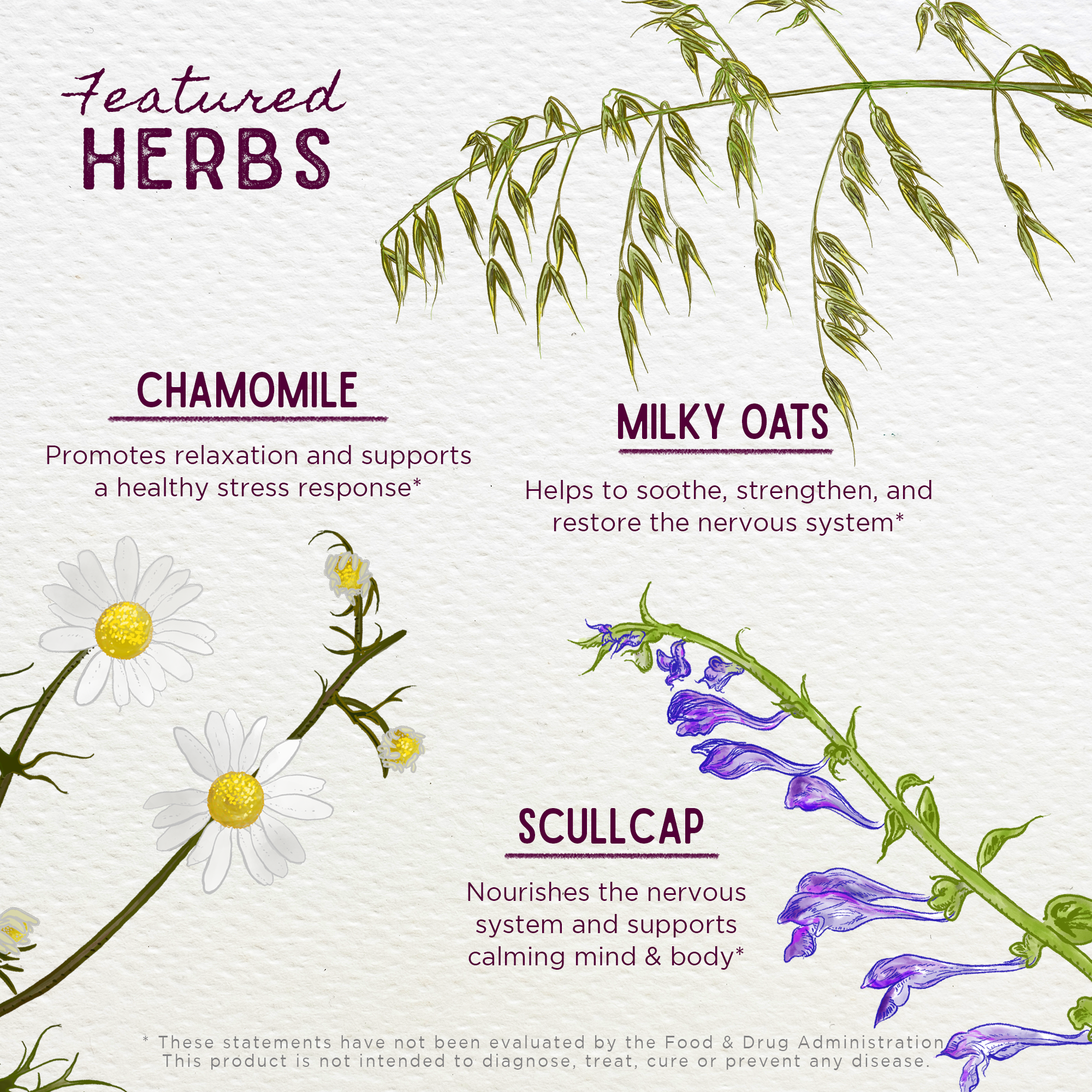 Organic Scullcap aerials (Scutellaria lateriflora), organic Linden leaf and flower (Tilia europea, T. cordata, T. spp.), organic Chamomile flower (Matricaria recutita, M. chamomilla), organic Milky Oat tops (Avena sativa), Vegetable glycerine, Rocky Mountain artesian spring water, organic apple cider vinegar & organic gluten-free alcohol.